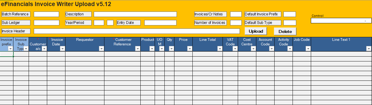 Excel Invoice Writer Workbook for uploading bulk invoices into eFinancials